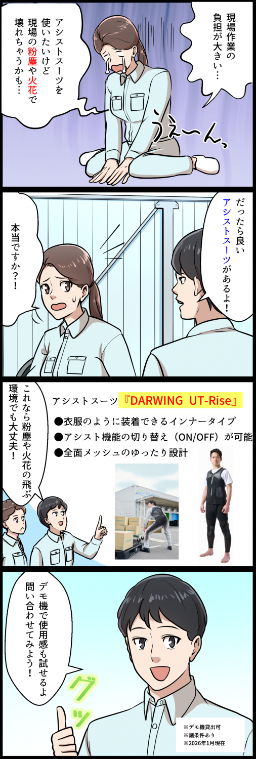 「もっと知りたい!」カナデン取扱製品を新たに発見できる 4コマ漫画 2026年1月21日 アシストスーツ『DARWING UT-Rise』 製品紹介ページはこちら 次の漫画 アシストスーツ『アルケリスFXスティック』 4コマ漫画一覧へ戻る
